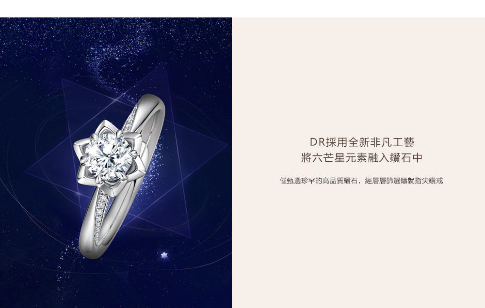 自品牌創立之初便立下世間獨特規定,每位男士憑身份證一生僅能定制一枚DR求婚鑽戒,贈予此生摯愛一人,寓意“一生 · 唯一 · 真愛”