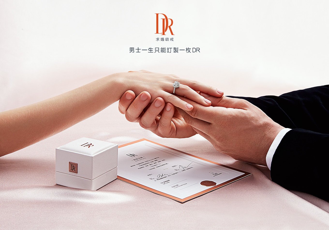 自品牌創立之初便立下世間獨特規定,每位男士憑身份證一生僅能定制一枚DR求婚鑽戒,贈予此生摯愛一人,寓意“一生 · 唯一 · 真愛”