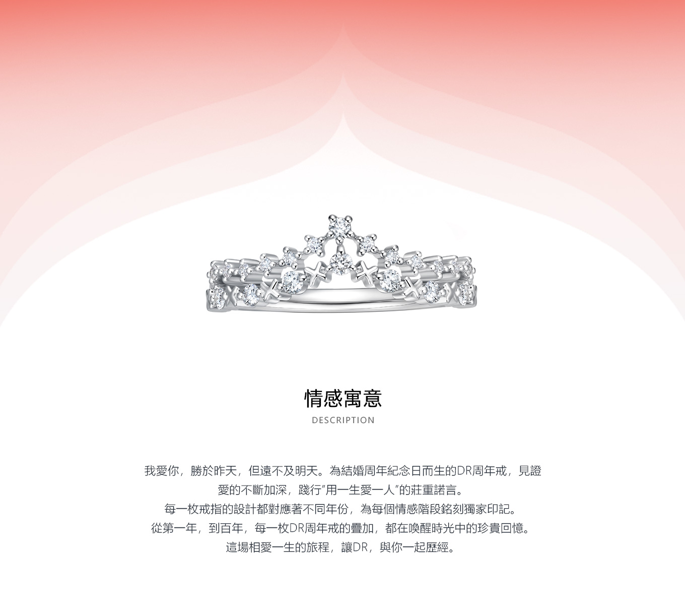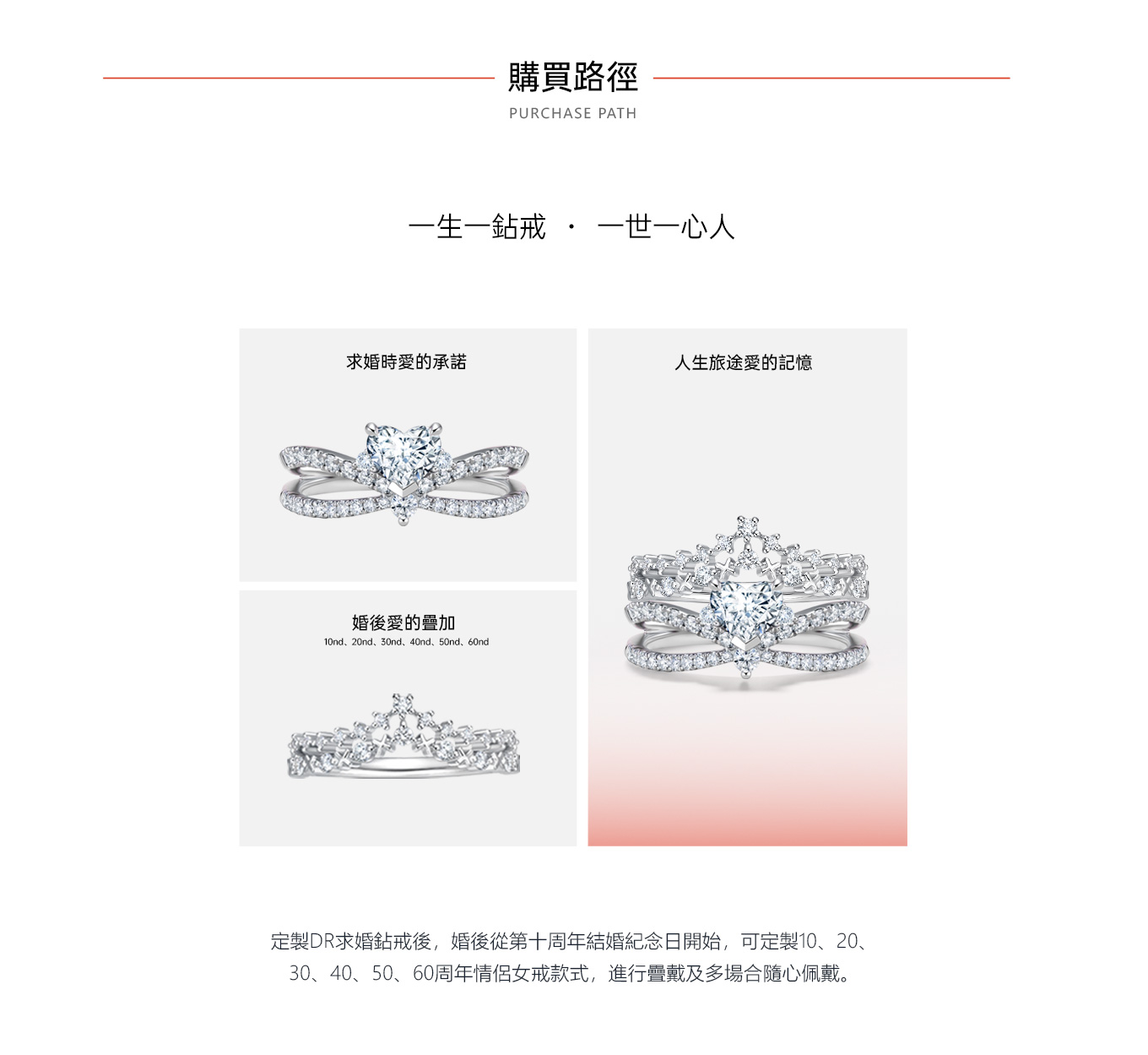 自品牌創立之初便立下世間獨特規定,每位男士憑身份證一生僅能定制一枚DR求婚鑽戒,贈予此生摯愛一人,寓意“一生 · 唯一 · 真愛”