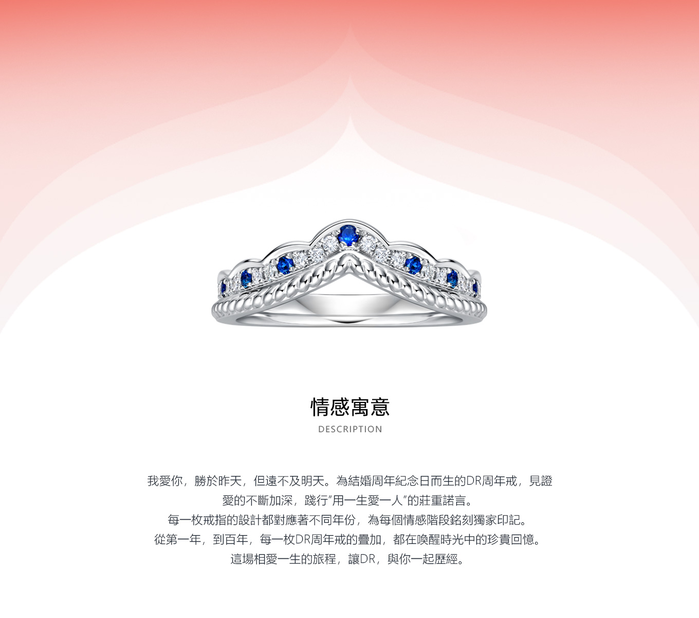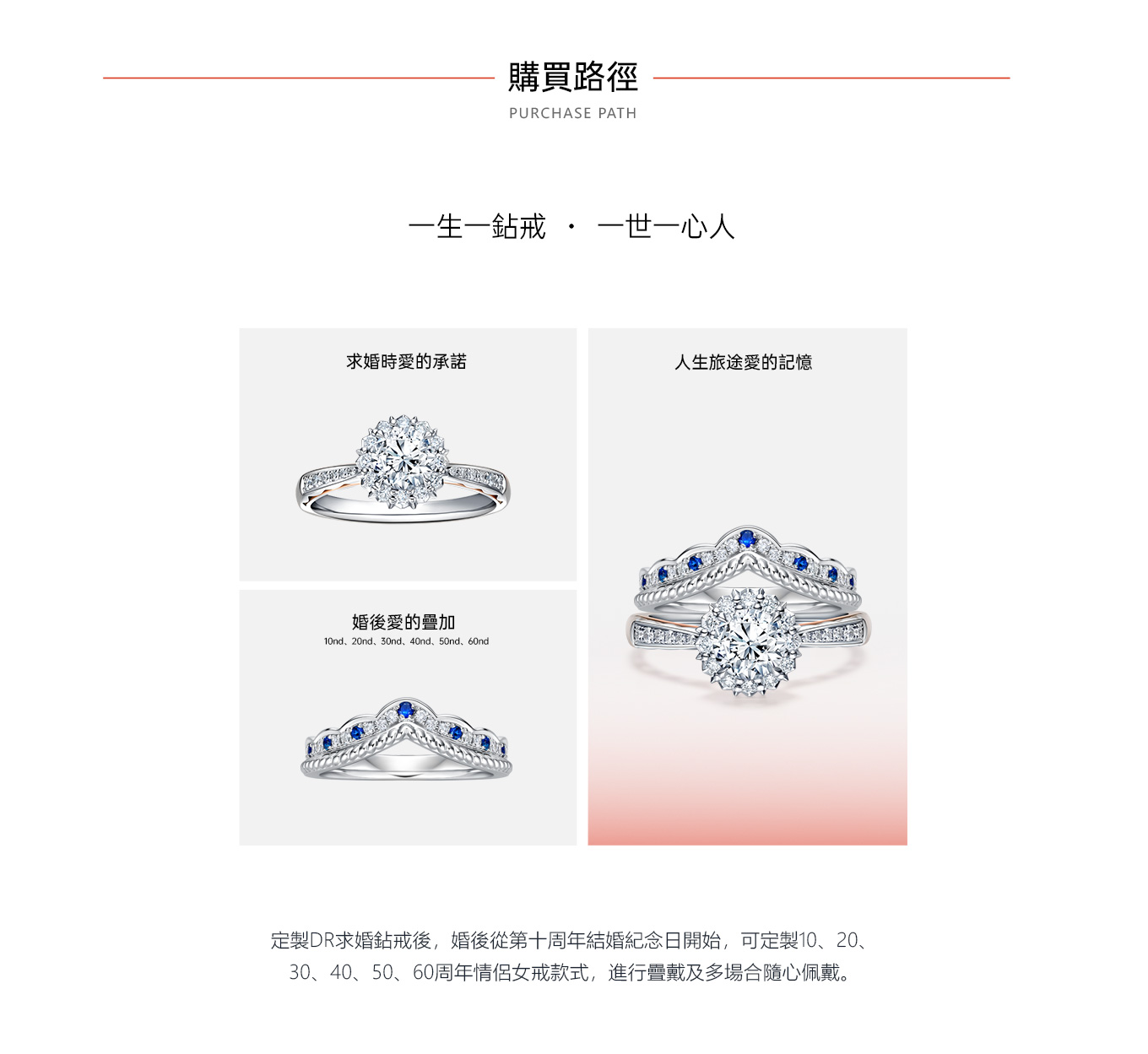 自品牌創立之初便立下世間獨特規定,每位男士憑身份證一生僅能定制一枚DR求婚鑽戒,贈予此生摯愛一人,寓意“一生 · 唯一 · 真愛”